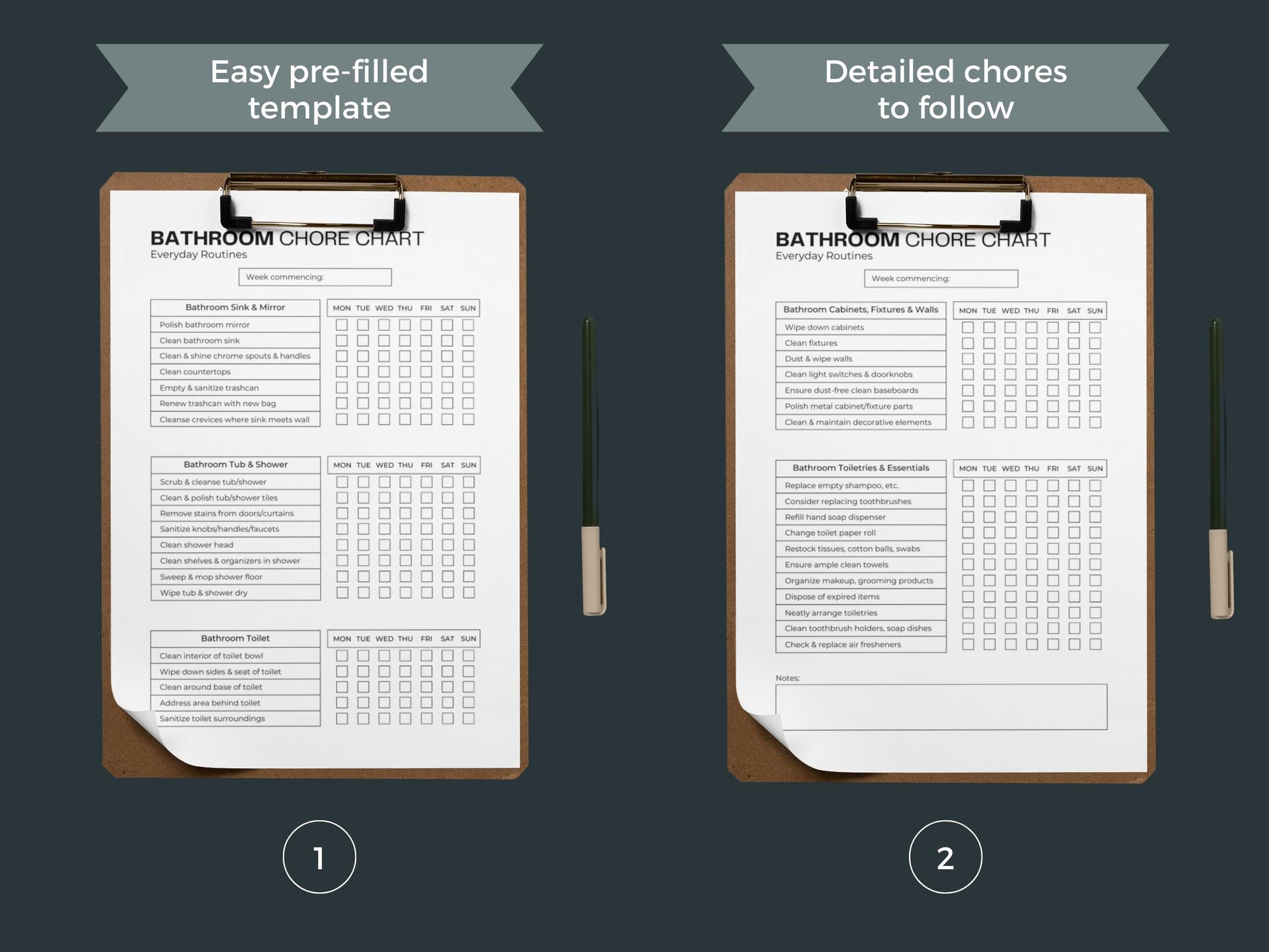 Our printable chore chart arrives pre-filled with essential bathroom tasks that need attention on a regular basis. From cleaning mirrors to restocking toiletries, each task is strategically organized. For those who prefer a more personalized touch, we've also included an empty template. This allows you to tailor the chart according to your bathroom's unique needs and your own preferences. Whether you're following the pre-filled guide or customizing it, the chart serves as a valuable tool to maintain a tidy and inviting bathroom environment.