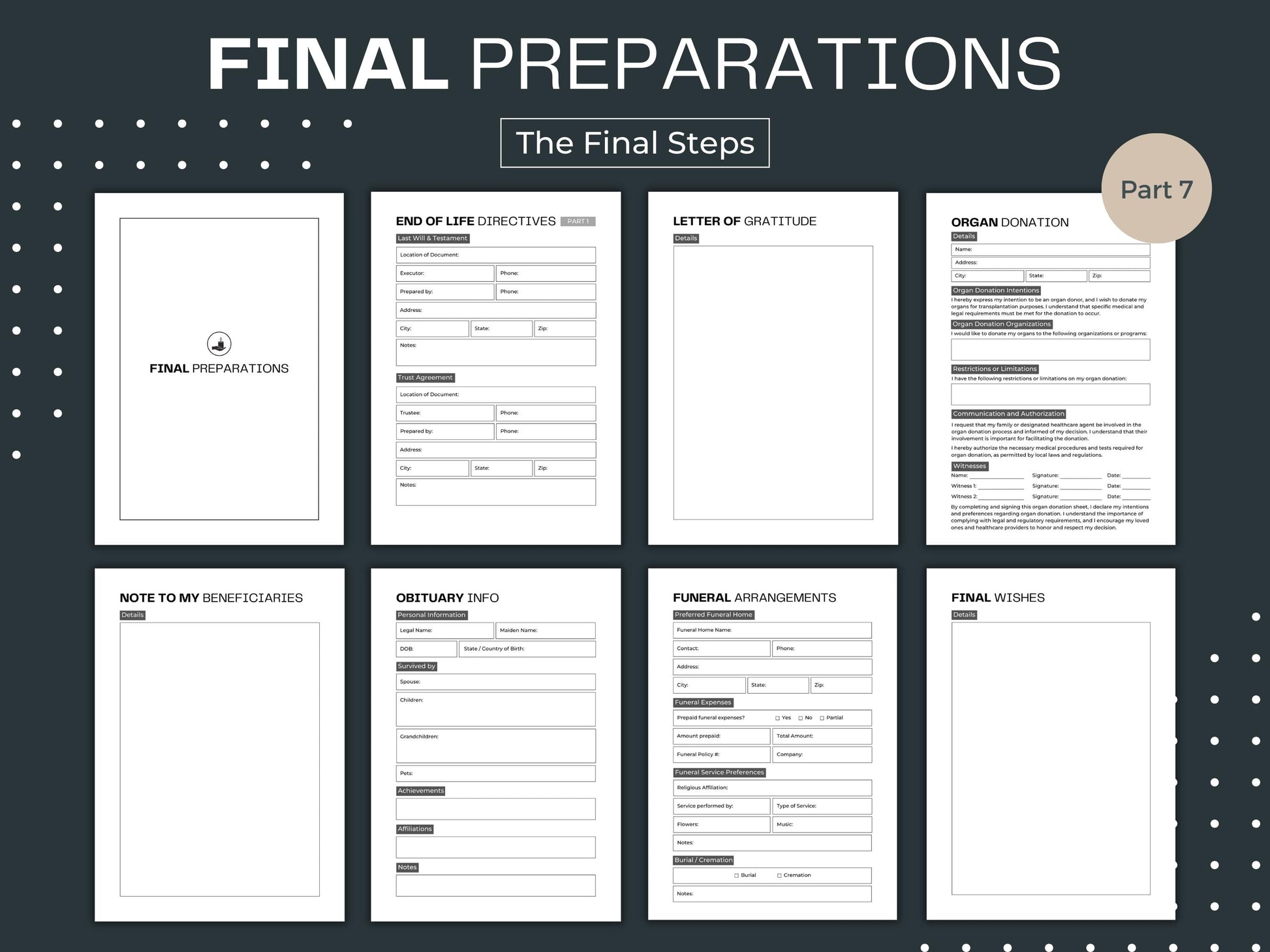 Preparing for the end of life also involves final preparations. This planner guides you in capturing your funeral and burial wishes, obituary information, and the location of important documents. By documenting these details, you alleviate the burden on your loved ones and ensure that your final wishes are honored.