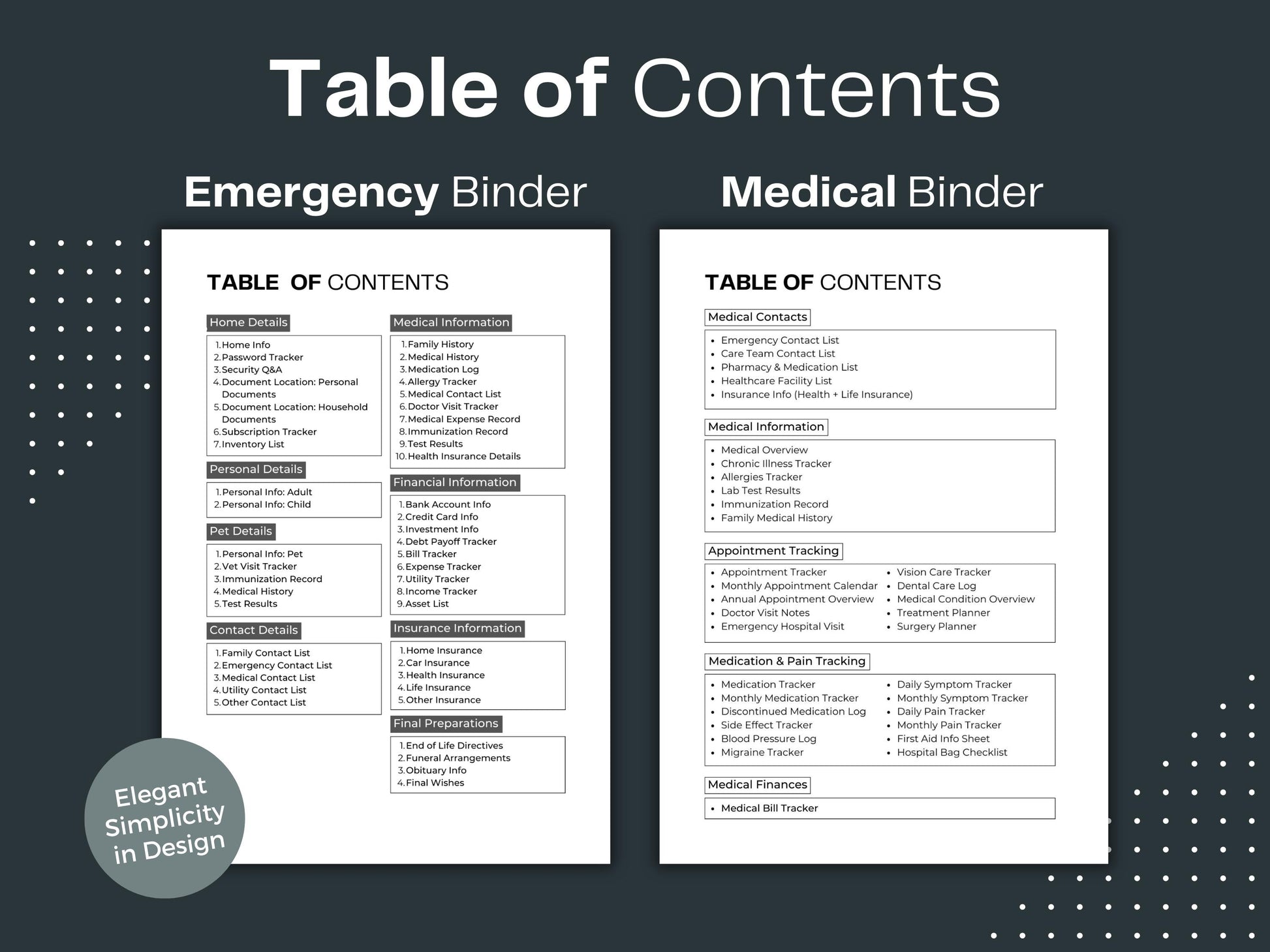 Elevate your life organization with our Life Binder Bundle, which includes both a Medical Binder and an Emergency Binder. Whether you're managing your healthcare or preparing for unexpected situations, this comprehensive bundle ensures quick access to your vital information. It provides a centralized and organized repository for all your healthcare details and emergency preparedness documents, ultimately promoting your well-being and peace of mind. Discover the convenience and assurance of proactive life management in one convenient package.