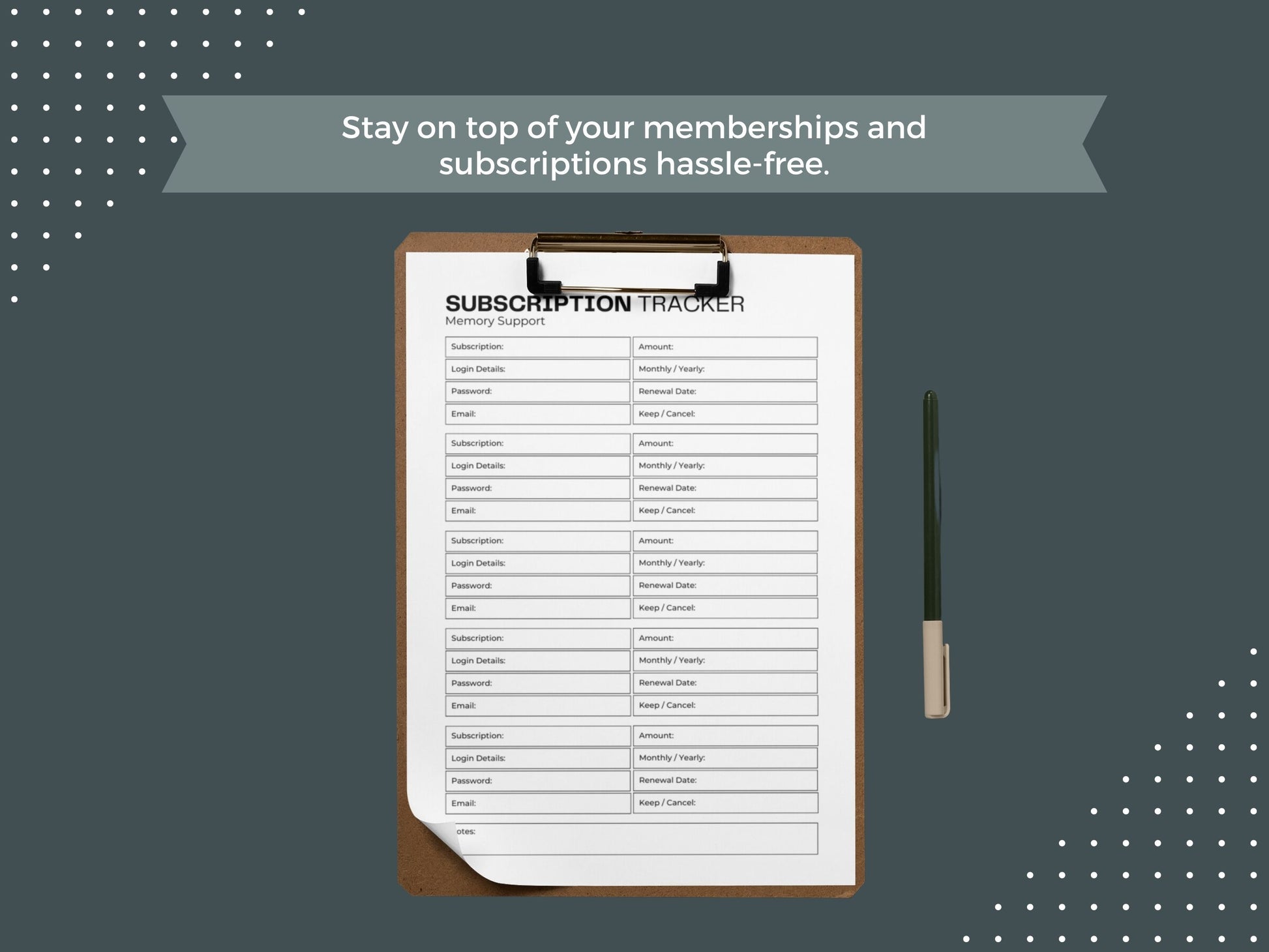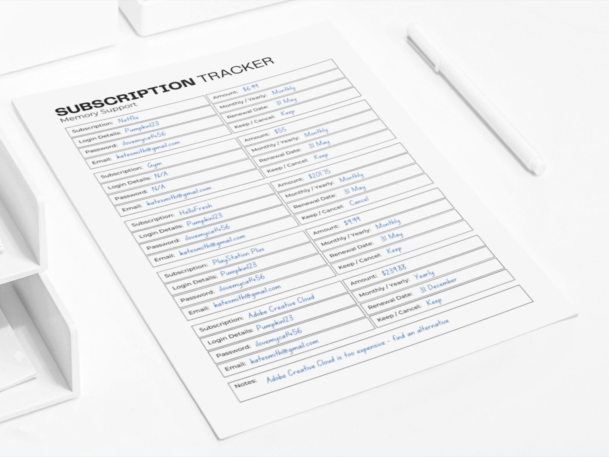 Track your recurring payments, renewal dates, and subscription details with ease. This carefully designed layout provides ample space to jot down important information, such as subscription names, costs, and billing cycles.