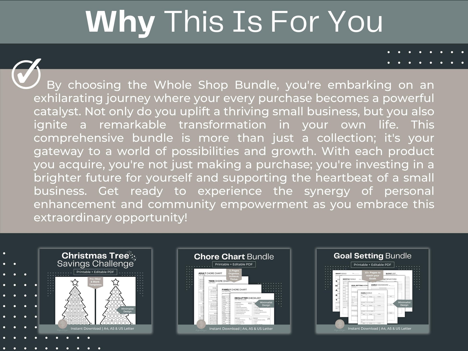 The Whole Shop Bundle is your gateway to unlocking the full potential of your life. It's more than a collection; it's a transformative opportunity. Get ready to embark on an exciting journey where every section of our Etsy shop combines to elevate your life in ways you've never imagined. Don't miss out on this extraordinary opportunity!